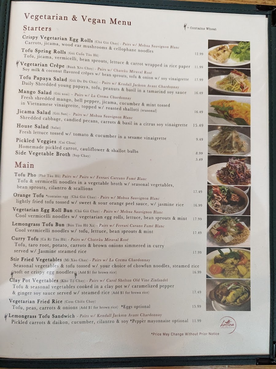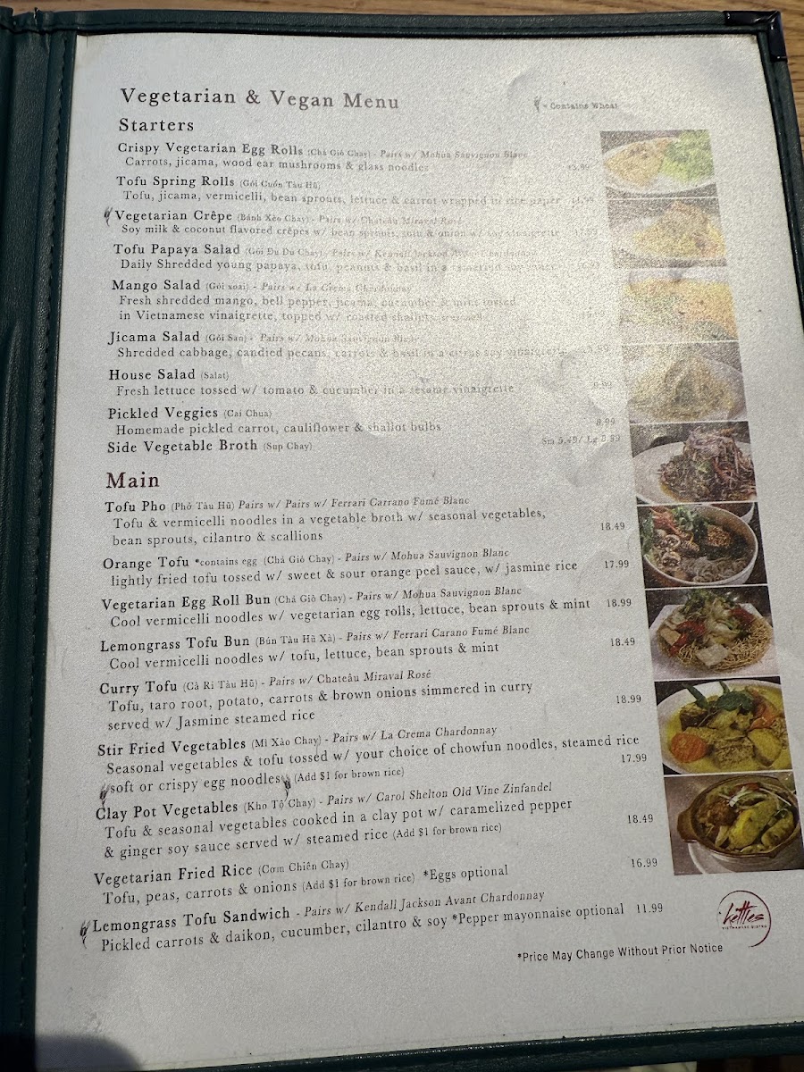 Vegan, vegetarian. Tofu, vermicelli noodles, seasonal veggies, cilantro, & scallions in vegetable broth.